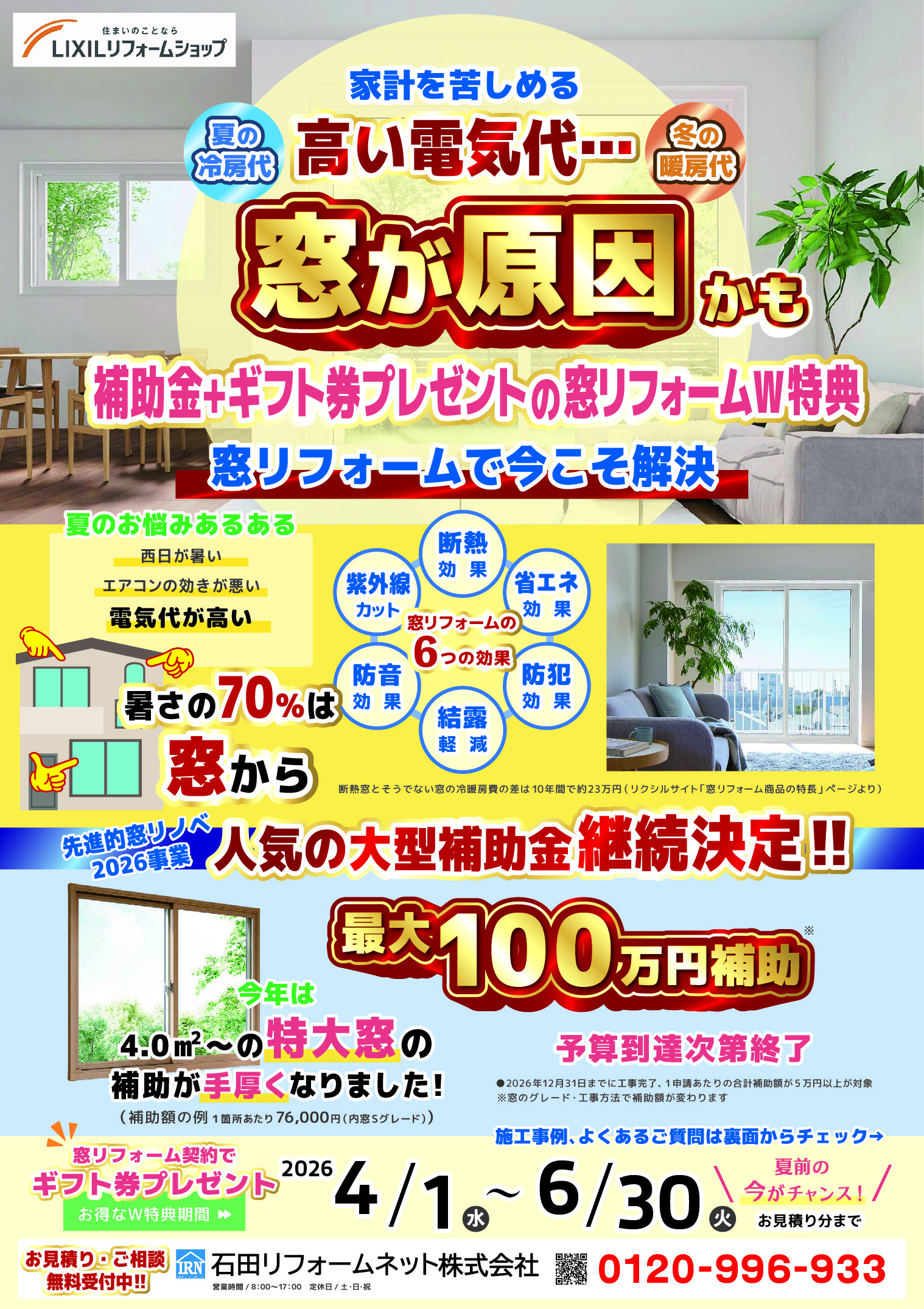 現在、窓リフォームは最大100万円の補助金が貰える。